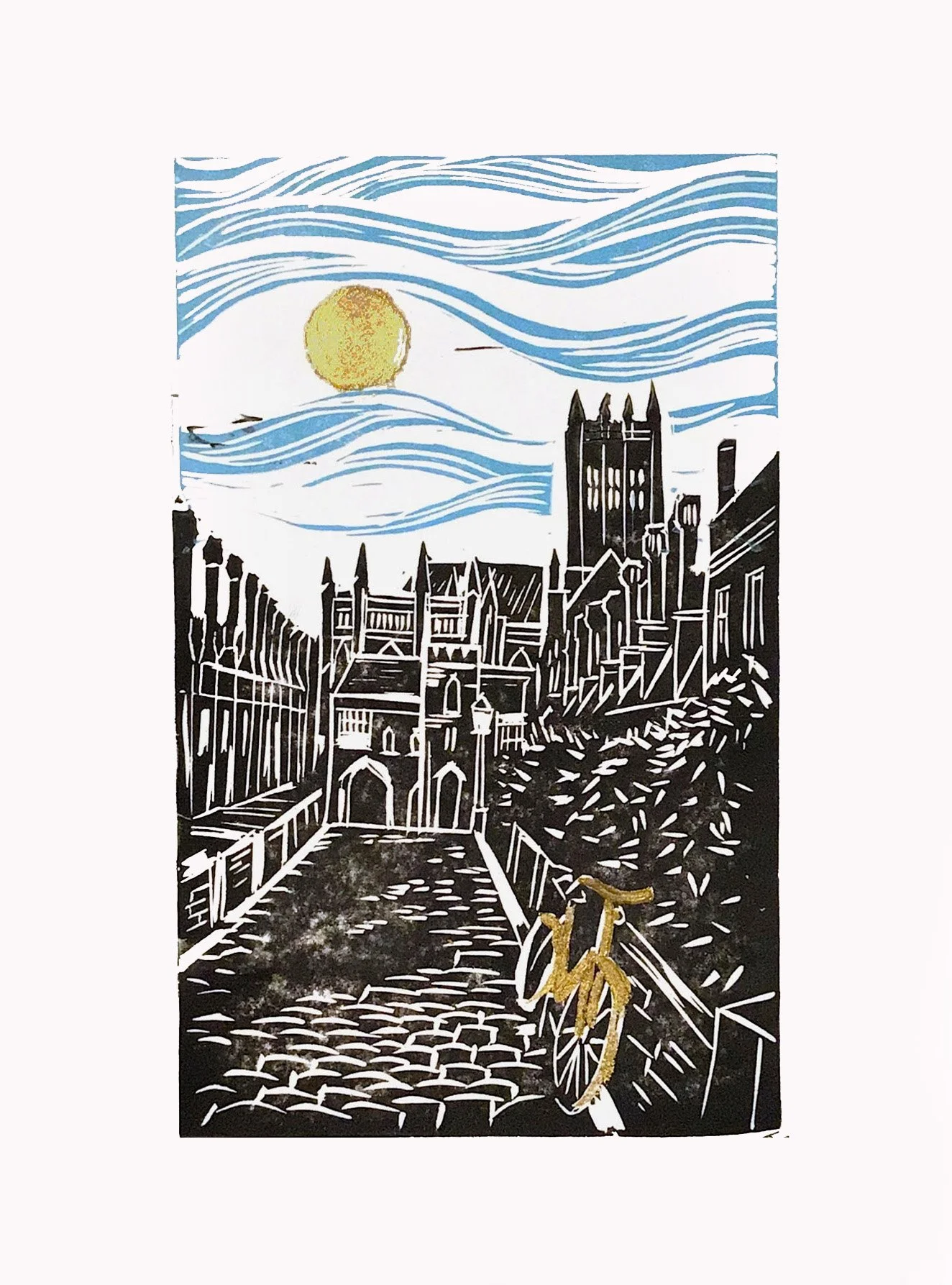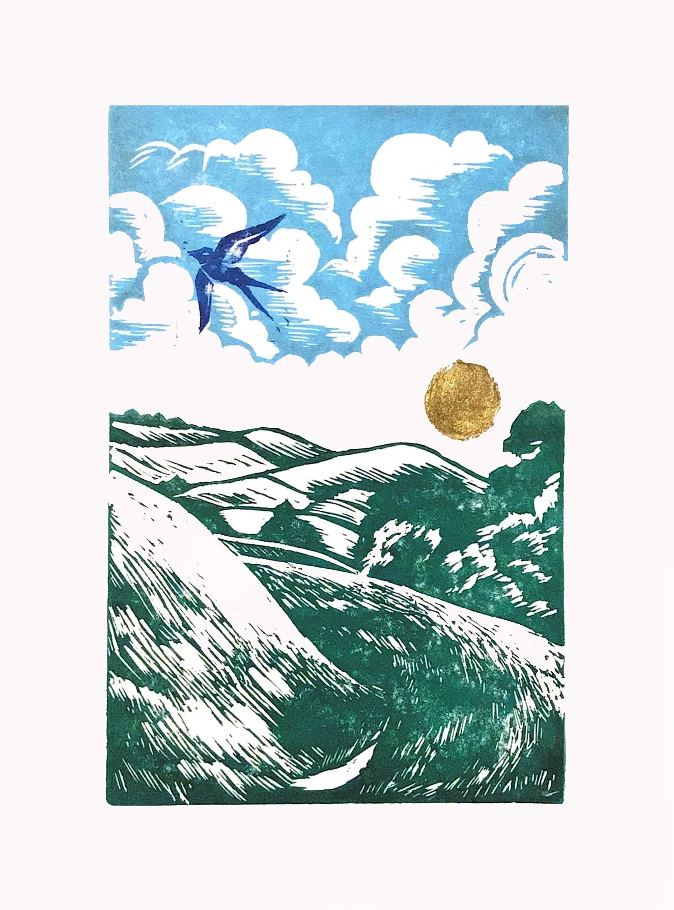 The themes of these pieces are places in the West Country we knew well, and revisit time and time again, making new memories as well as old. Unfortunately loved ones depart, and sometimes all that are left are the places where those memories live on. Lino-cut felt like the perfect medium to hark back to those traditional styles you’d see with landmarks like these, such as illustrated companion guides. The use of black and green is symbolic of what still stands. The blue skies the ether beyond, we can never truly grasp. And finally gold is symbolic for the spirit that still glistens even afterwards.